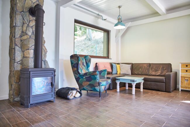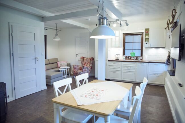 50 m2 salon z w pełni wyposażonym aneksem kuchennym sypialnia łazienka teras z kompletem mebli wypoczynkowych cudowny widok na jezioro